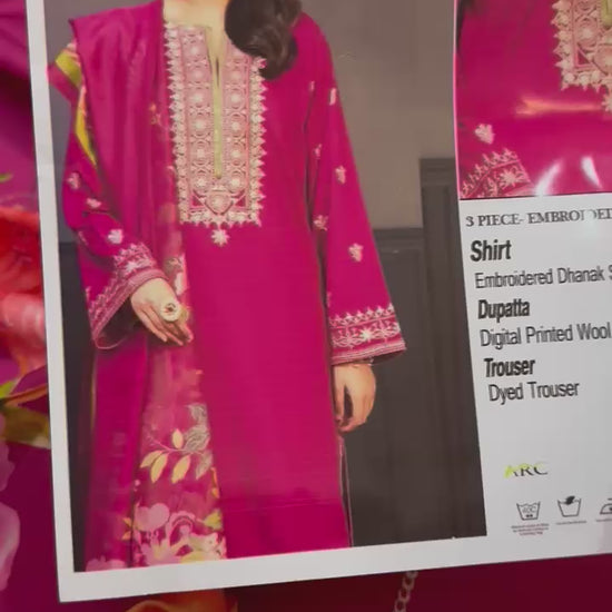 Step into elegance and grace with the exquisite 3-piece Dhanak embroidered suit, perfectly designed for the season's festivities and Eid celebrations. This stunning ensemble features a meticulously crafted shirt adorned with captivating single-color embroidery, flawlessly paired with loose trousers embellished with matching embroidery details. Completing the ensemble is a contrasting whool printed shwal, adding a touch of sophistication to your attire. A must-have for every fashion-forward individual, this ensemble effortlessly blends traditional charm with contemporary flair, ensuring you stand out with unparalleled style and grace. Elevate your wardrobe with this timeless masterpiece and make a statement wherever you go this season.