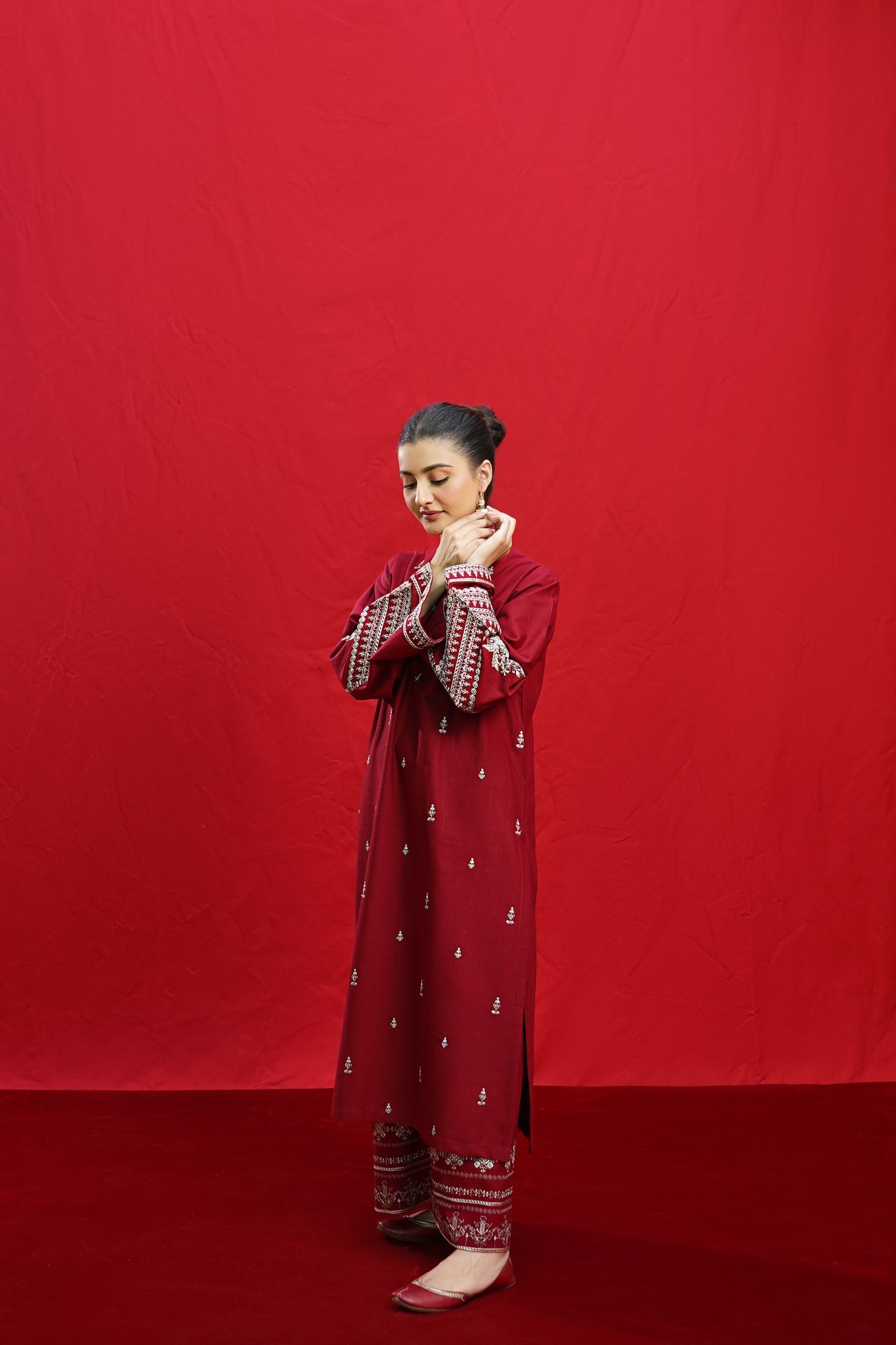 The ELKA is a UNSTICED 3pc DHANAK suit that combines intricate embroidery on the shirt and sleeves with a bold embroidered motif. Paired with loose embroidered trousers and a printed WHOOL SHWAL, it offers a sophisticated and effortless look for any occasion.