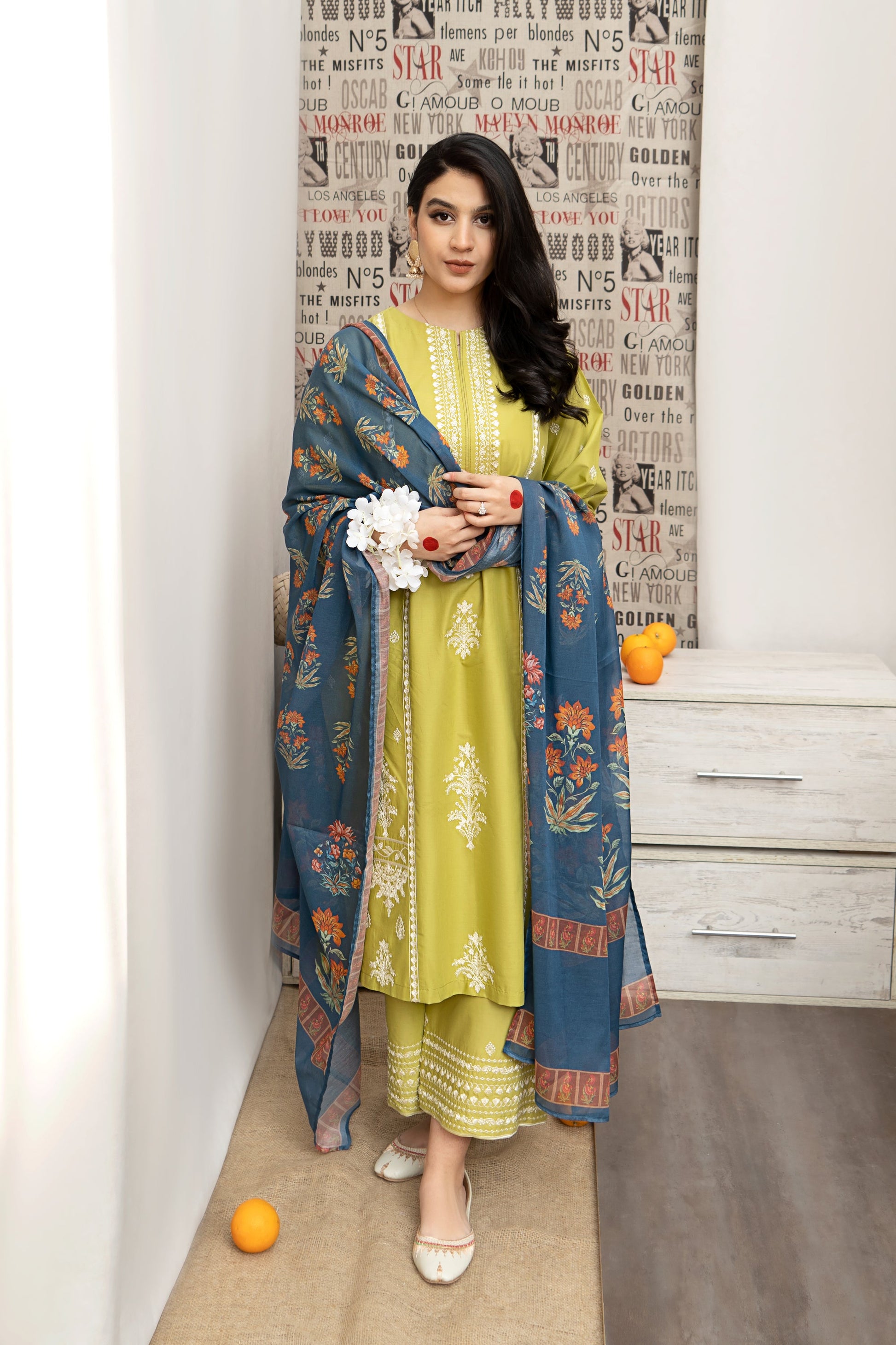 Step into elegance and grace with the exquisite 3-piece Dhanak embroidered suit, perfectly designed for the season's festivities and Eid celebrations. This stunning ensemble features a meticulously crafted shirt adorned with captivating single-color embroidery, flawlessly paired with loose trousers embellished with matching embroidery details. Completing the ensemble is a contrasting whool printed shwal, adding a touch of sophistication to your attire. A must-have for every fashion-forward individual, this ensemble effortlessly blends traditional charm with contemporary flair, ensuring you stand out with unparalleled style and grace. Elevate your wardrobe with this timeless masterpiece and make a statement wherever you go this season.