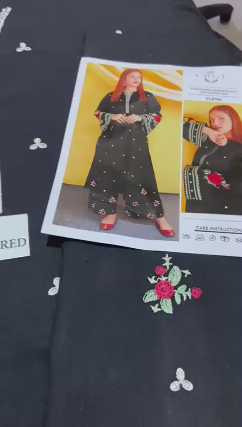 Ithe perfect addition to your wardrobe. This 2-piece embroidered suit features a long shirt with an intricately embroidered neckline, as well as a spray of embroidery motifs on the side panels and sleeves. Paired with loose embroidered trousers, this unsticed suit is sure to make a statement with its intricate details and elegant design. Upgrade your styleย